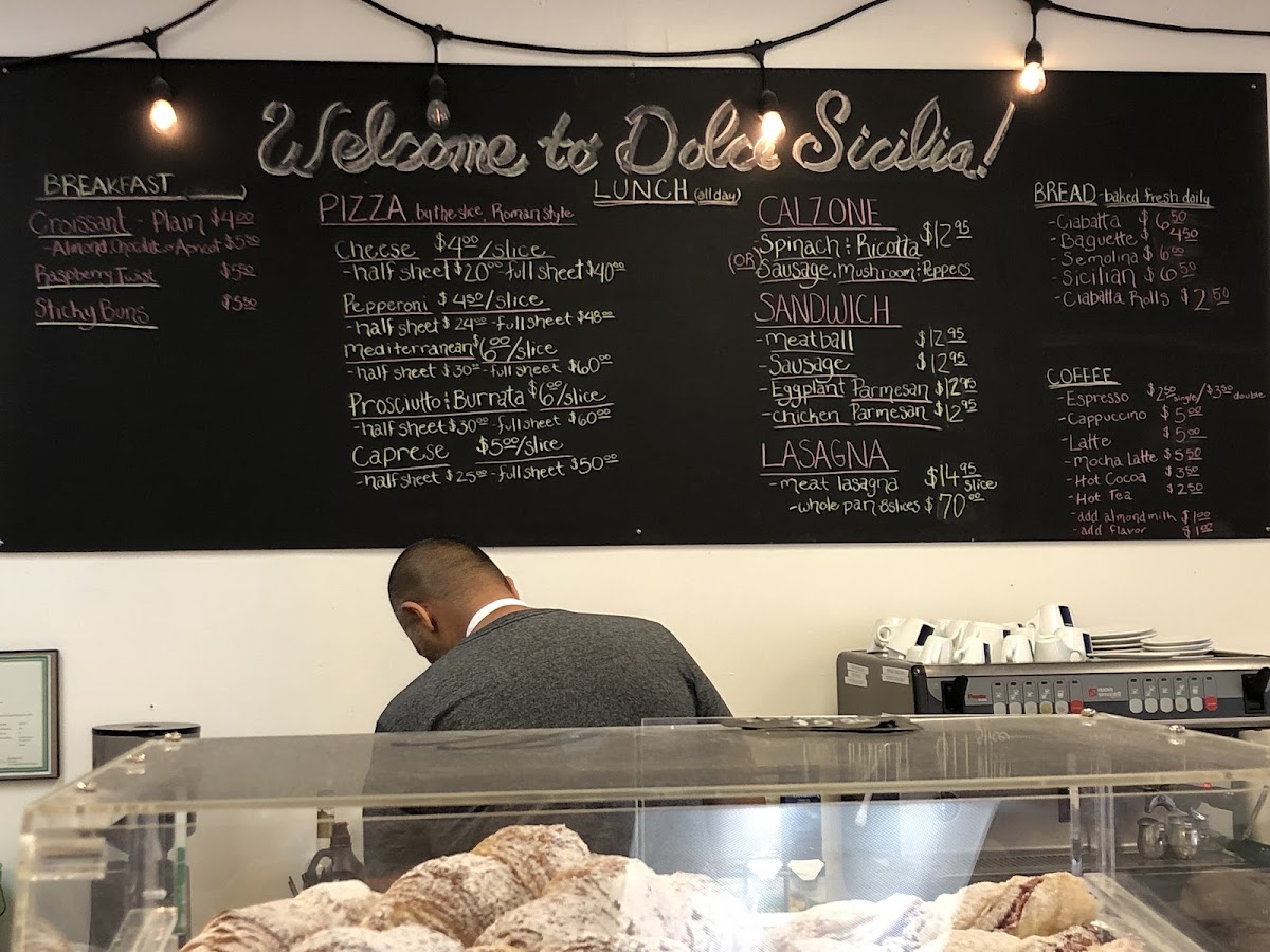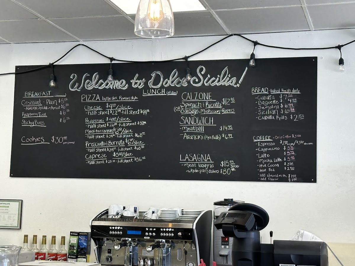 The menu at Dolce Sicilia Italian Bakery offers a variety of Italian bakery items alongside breakfast options, savory dishes, and beverages. The selection includes traditional pastries such as cannolis, almond croissants, cream puffs, pignoli cookies, sfogliatella, and Sicilian pistachio cookies, as well as classic Italian desserts like tiramisu and dolce al cucchiaio.